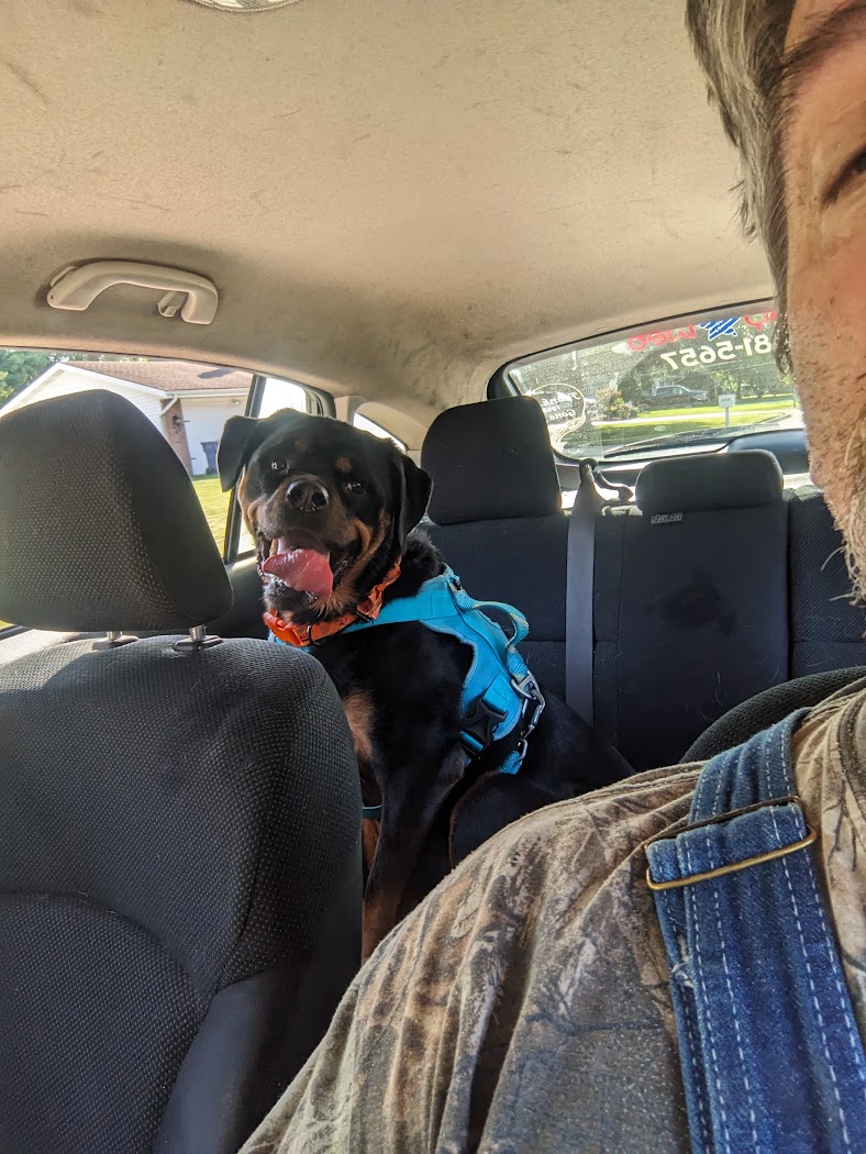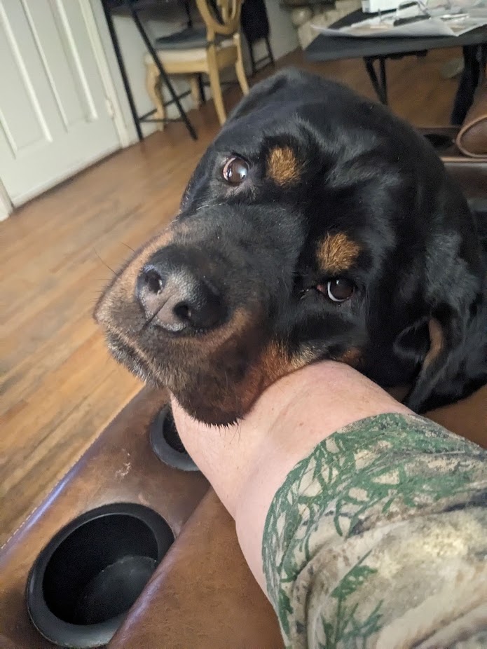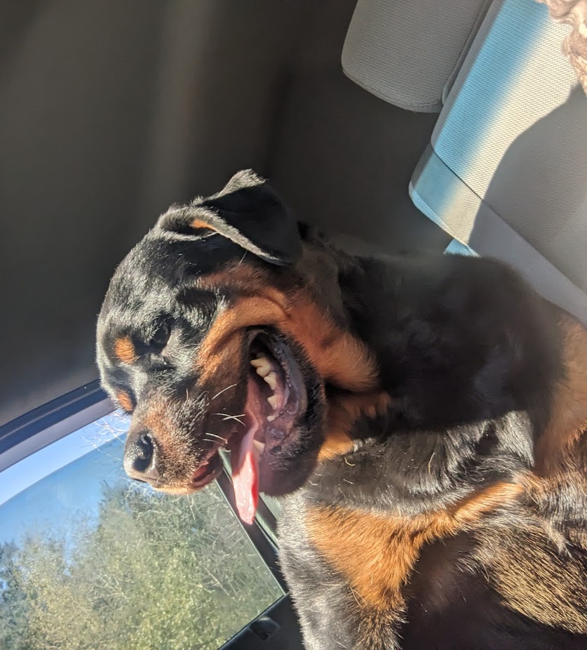 Luna #1 was adopted by mother and daughter team Rene and Ashley Fellows in 2021 from Max and Roxy's first litter. Rene passed away August 2025, and Ashley reached out to us for our guidance and help, realizing that Luna could no longer stay with her family. We have a Right of First Refusal clause in our adoption contract for situations just like this where the adopted Rottweiler needs to be rehomed. It gives us the right and accountability to participate in the rehoming process to ensure that a dog that we intentionally brought into this world doesn't wind up in a shelter to be euthanized.