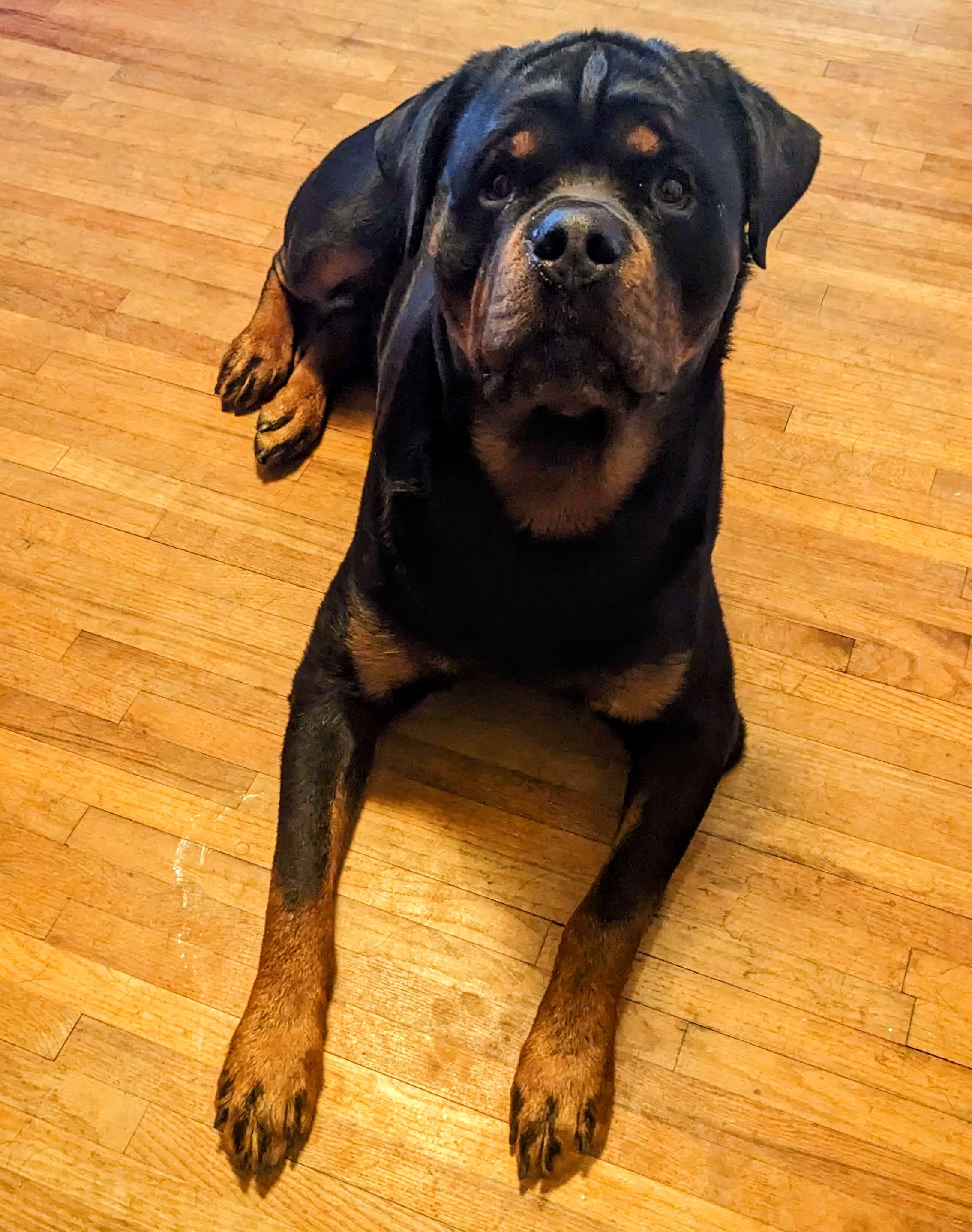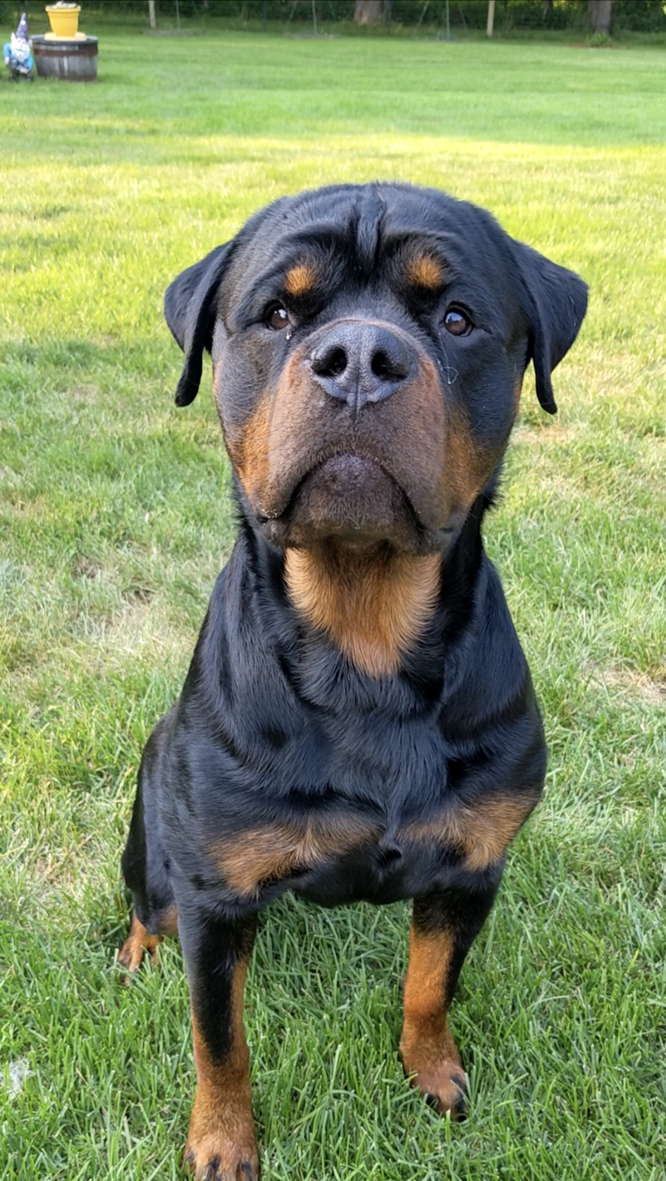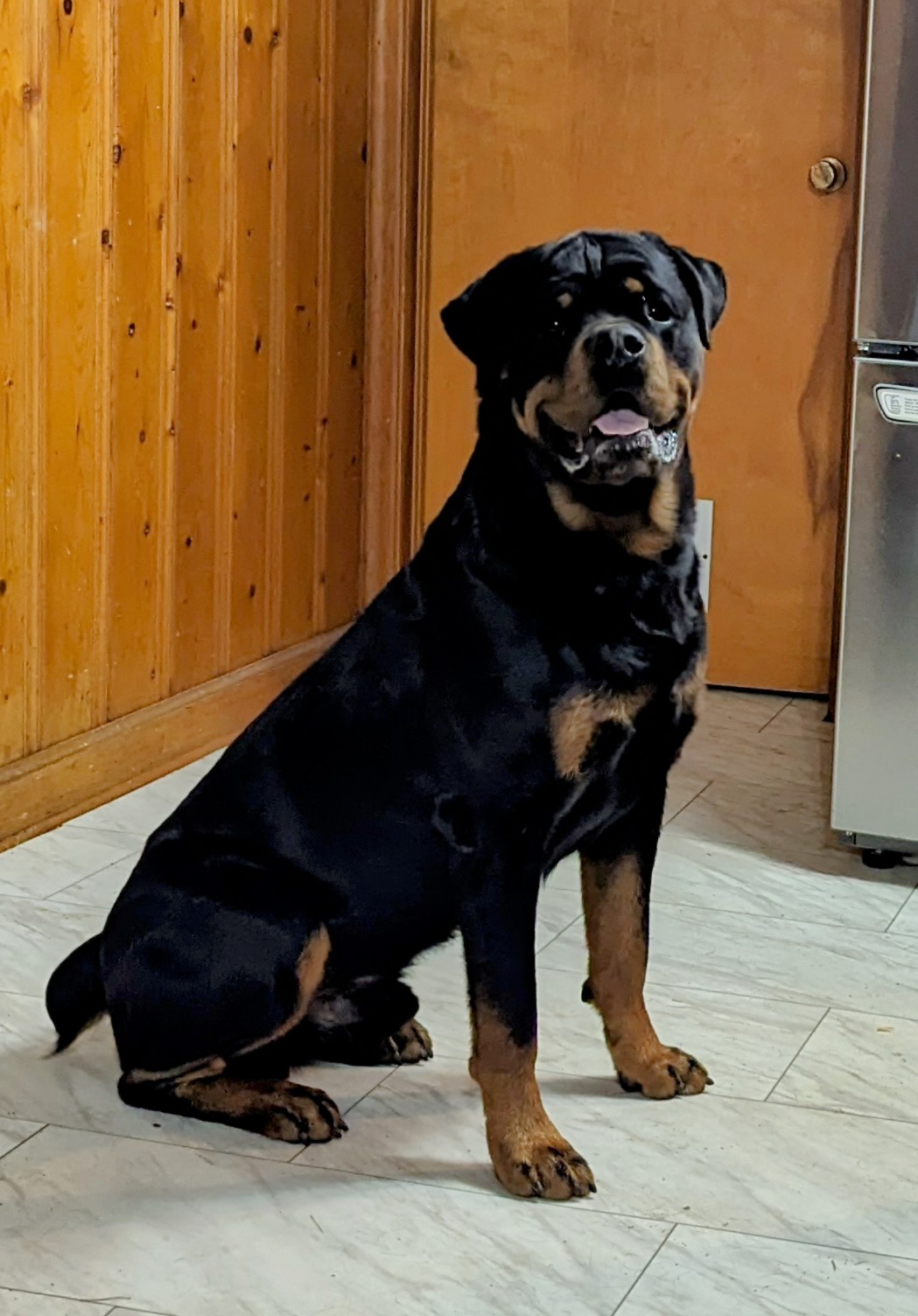 Max joined our family in 2021 at 2 years old. Despite having two previous owners and NO training, he has blended into our family as if he'd been with us since birth. He is a sweet, gentle giant with a bark that will rattle the dishes. He has a solid build & gorgeous mahogany markings and meets all of the AKC breed standards. His biggest obsession is going for rides in "his" truck, although a very close second is the belly rub. Max is in tact and has been our star boy for breeding to date!