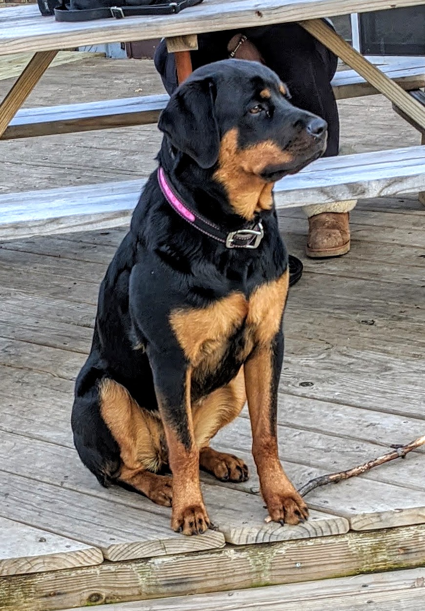 Roxy joined our family as a puppy in 2019 and is the reason we fell in love with the breed. She is amazingly intelligent, and her temperament is sweeter and gentler than she is smart - and that little stinker is extremely intelligent. She loves to pound around on our 6 acres with all of the critters and the rest of the Rott-pack. She was fully trained (well, WE were fully trained) by Danita Pasch (of Pasch's Beautiful Bernese) in Rockford, and we firmly believe that all Rottweilers need and deserve to be fully trained. The obedience, loyalty, love, and joy she brings us is proof of that. In April 2025 Roxy made her 4th and final pairing attempt with Max, which failed. Roxy has since been retired and now gets to take it easy and enjoy the rest of her life on the Ranch, keeping them boys straight! Roxy gave us three litters and 26 puppies. She is a gift, she is a blessing.